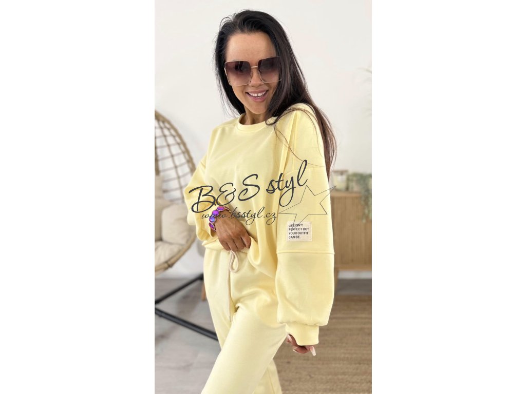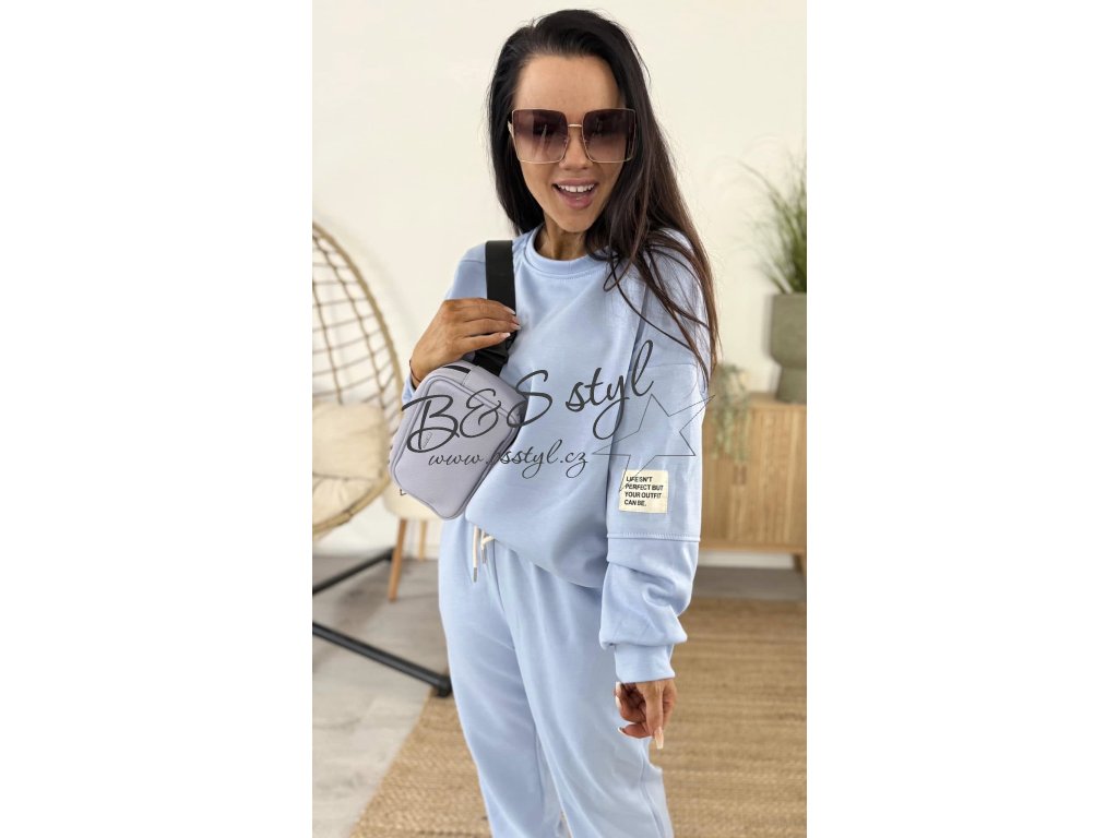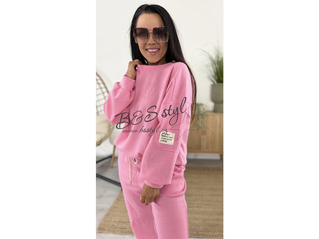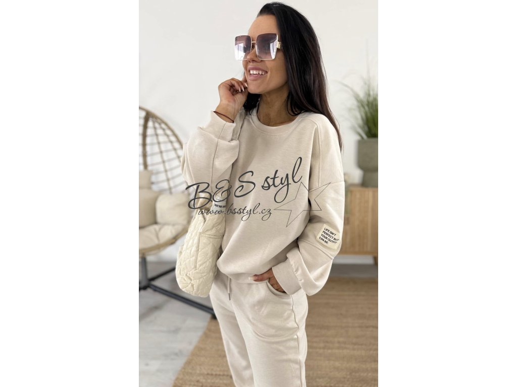 mikina s kulatým vystřihem a detailem na rukávu v podobě nášivky