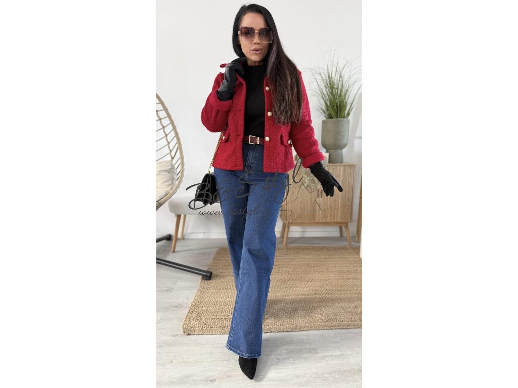 Kabátek má krásně sytou barvu a je slušivý postavě.