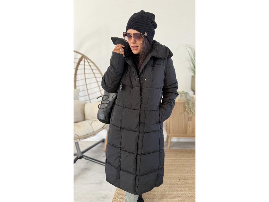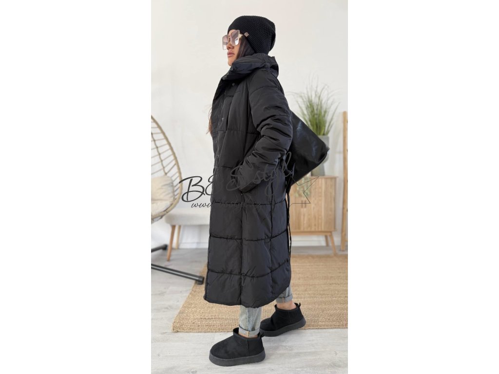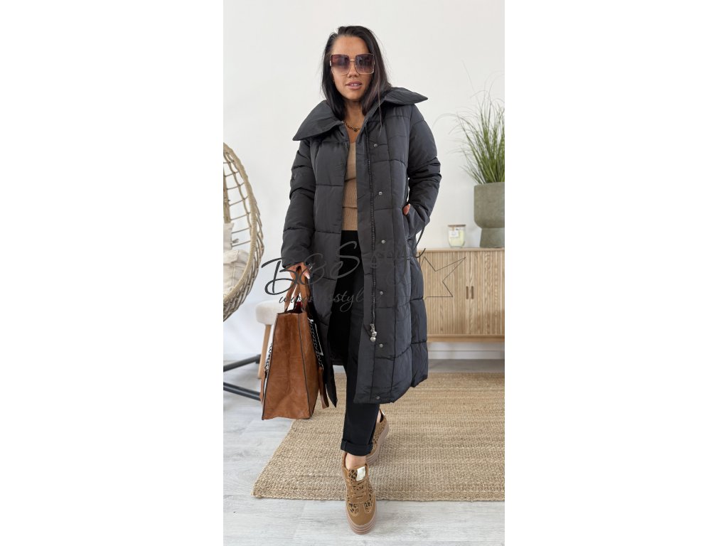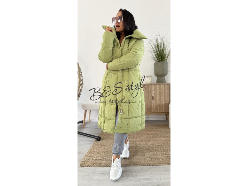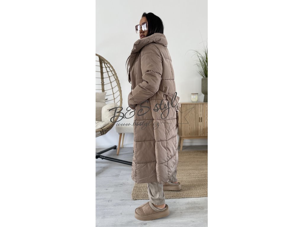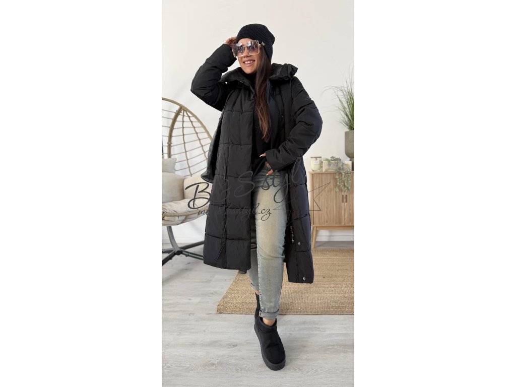 Dlouhý kabát rovného střihu s páskem , pásek lze nosit zavázaný klasik , nebo za zády pro zdůraznění siluety