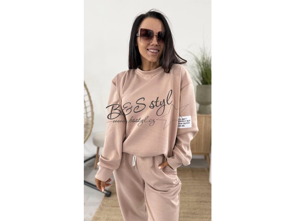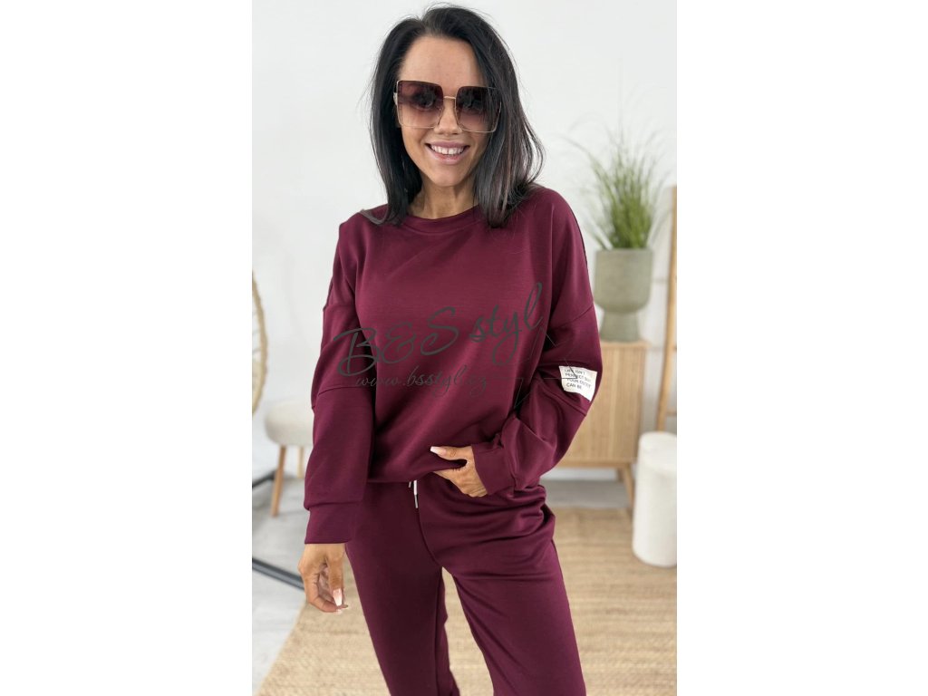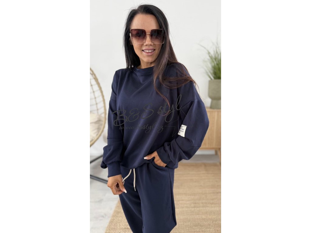 mikina s kulatým vystřihem a detailem na rukávu v podobě nášivky