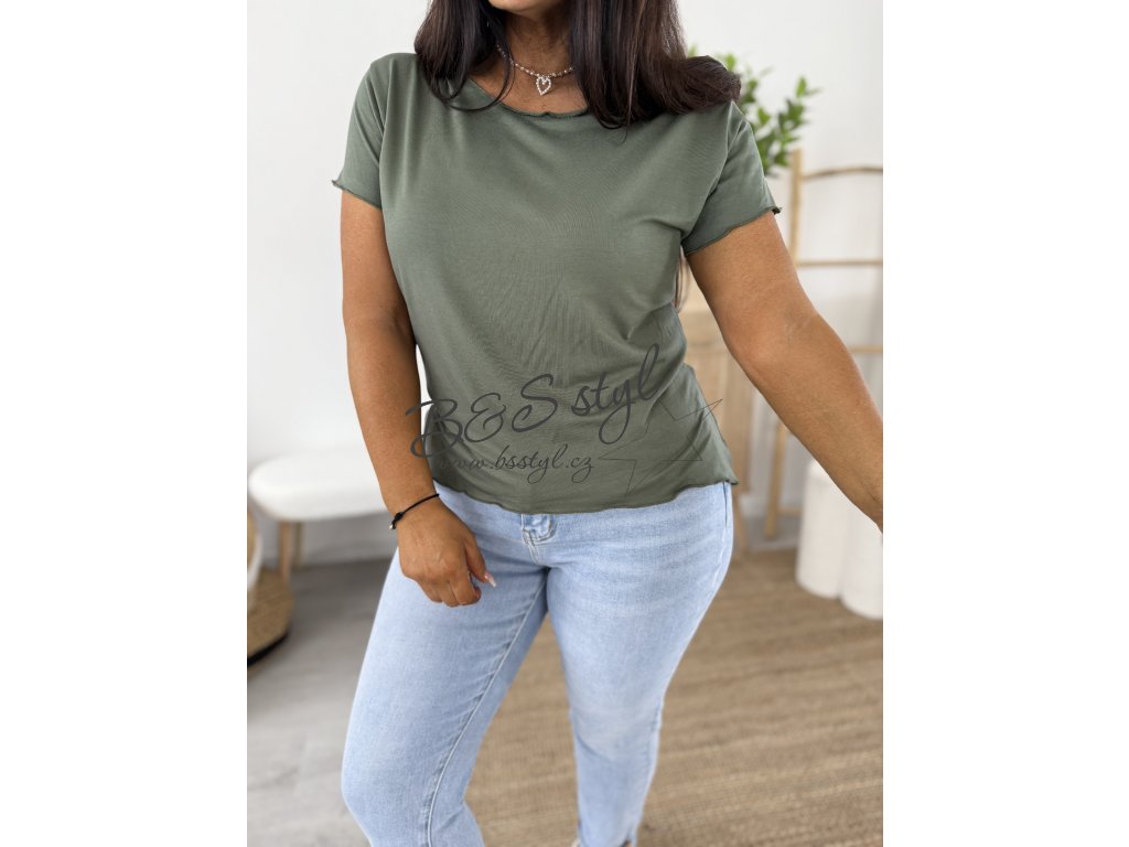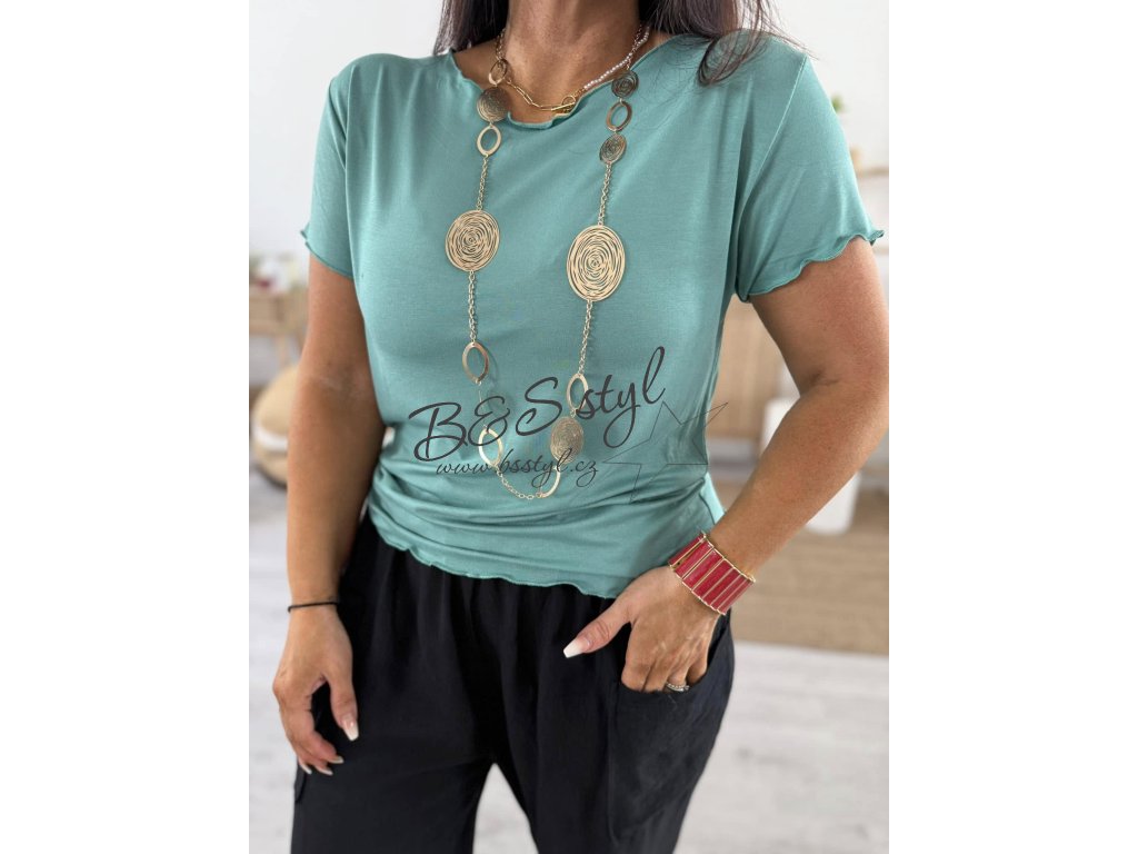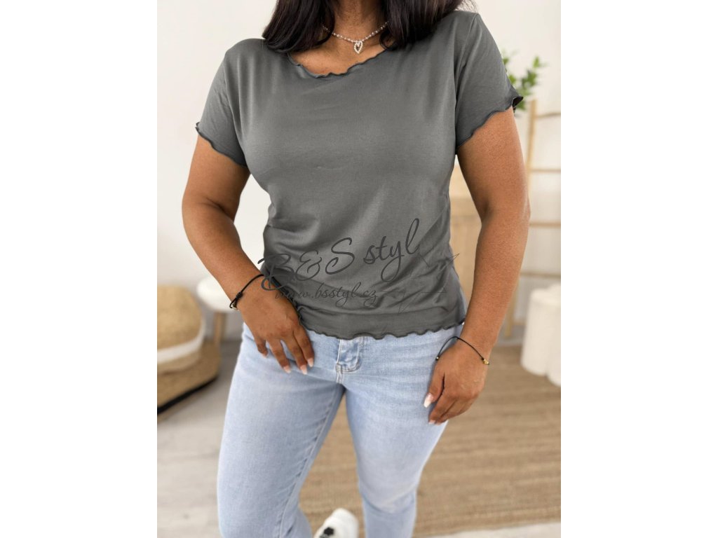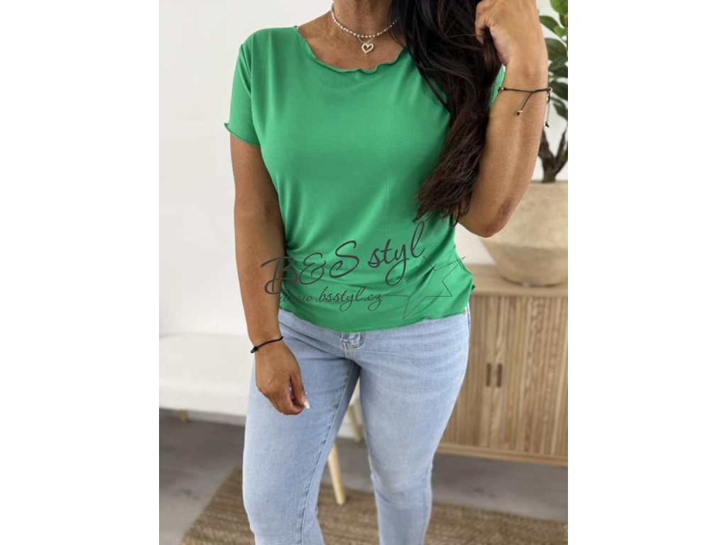 lodičkový výstřih s vlnitým lemem, který je i na rukávu